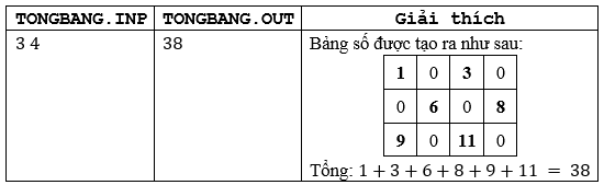 Tại vị trí dòng i và cột j trên bảng số sẽ được ghi số ~(i-1)*N+j~ nếu (~i+j~) là số chẵn, và ghi số 0 nếu (~i+j~) là số lẻ (~1≤i≤M~,~1≤j≤N~).